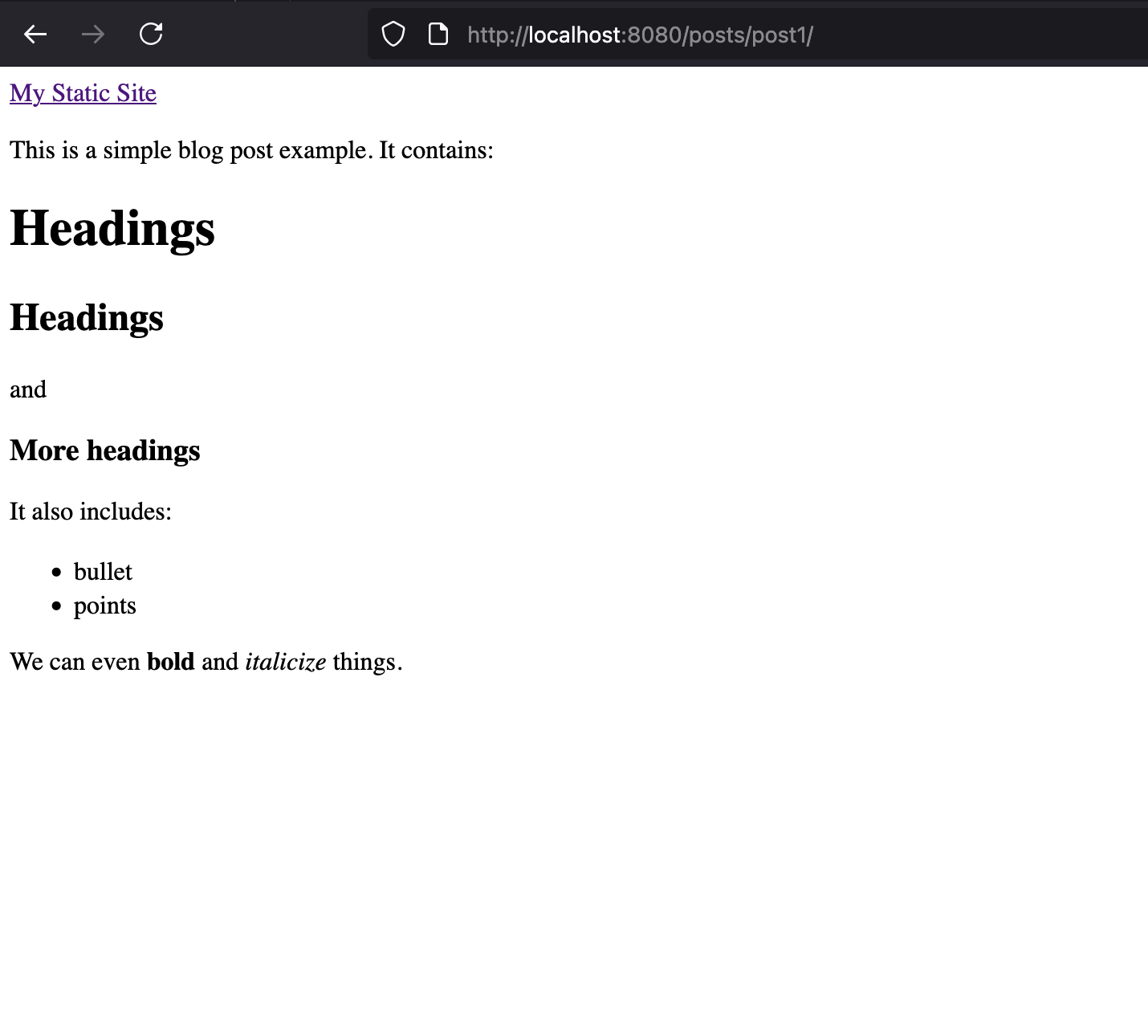 Now, if you go back to your browser and open http://localhost:8080 you should see your blog post listed on the home page. Click it, and you'll see the simple navbar (with the link back to the home page) is still there, but your blog post content is rendered at the correct URL.