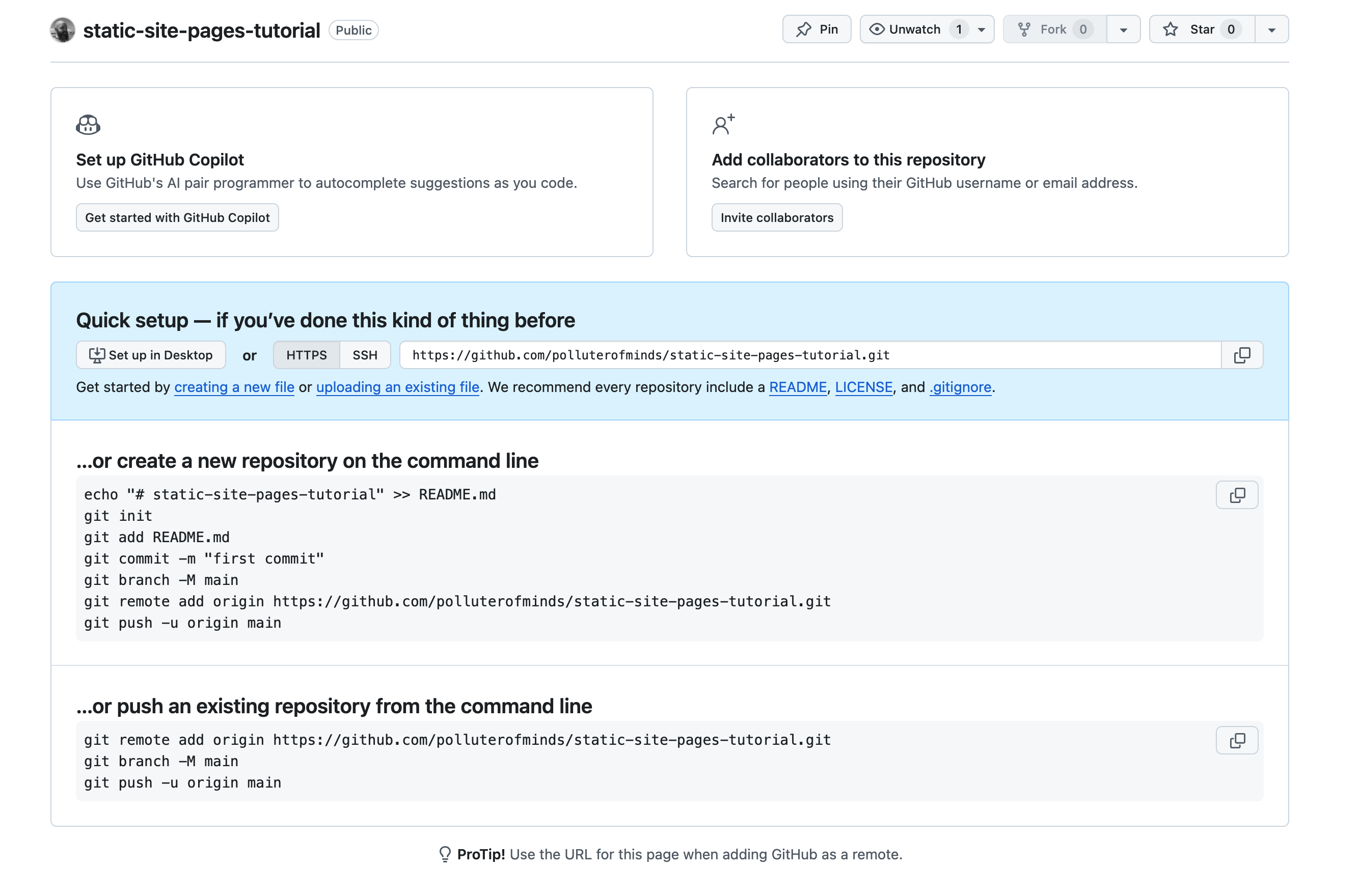 From your Github profile page, you should see a New Repository button. If not, click the Repositories link, then create a new one from there. Give your repository a name that represents your static site and decide if you want it public or private. When you've done this, you'll see a page like this: