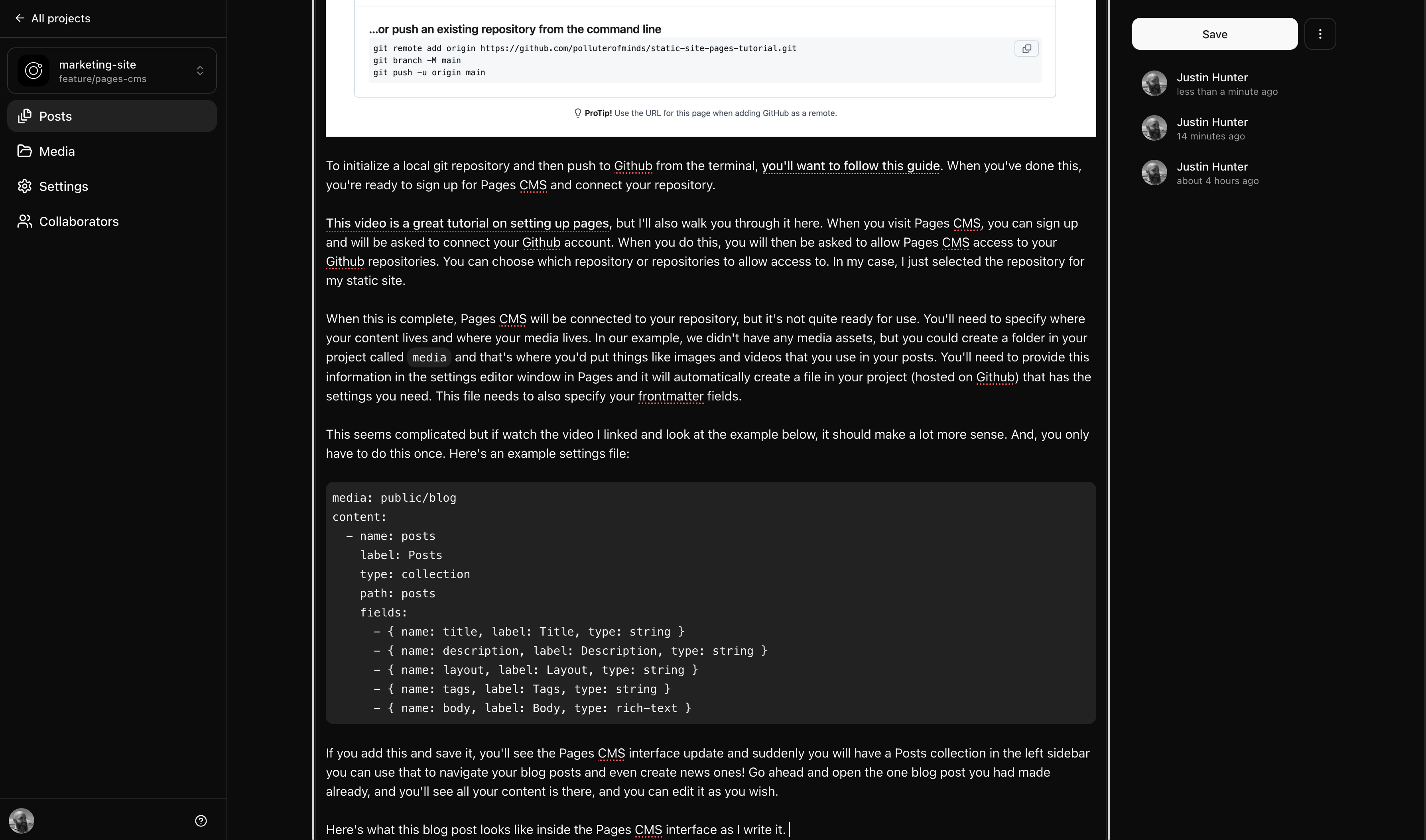 You now have a static site generated blog set up! You can create as many posts as you want, but what if you want an easier way to compose those posts? And what if you want to invite others who might not be so comfortable with the code editor and terminal? That's where a headless CMS like Pages CMS comes in.