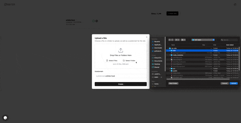 npm run buildThis will create a dist folder in your project directory. You’ll want to upload that folder to Orbiter. Log into Orbiter, then click the Create Site button. You can drag the dist folder into the modal or you can click the select folder button.