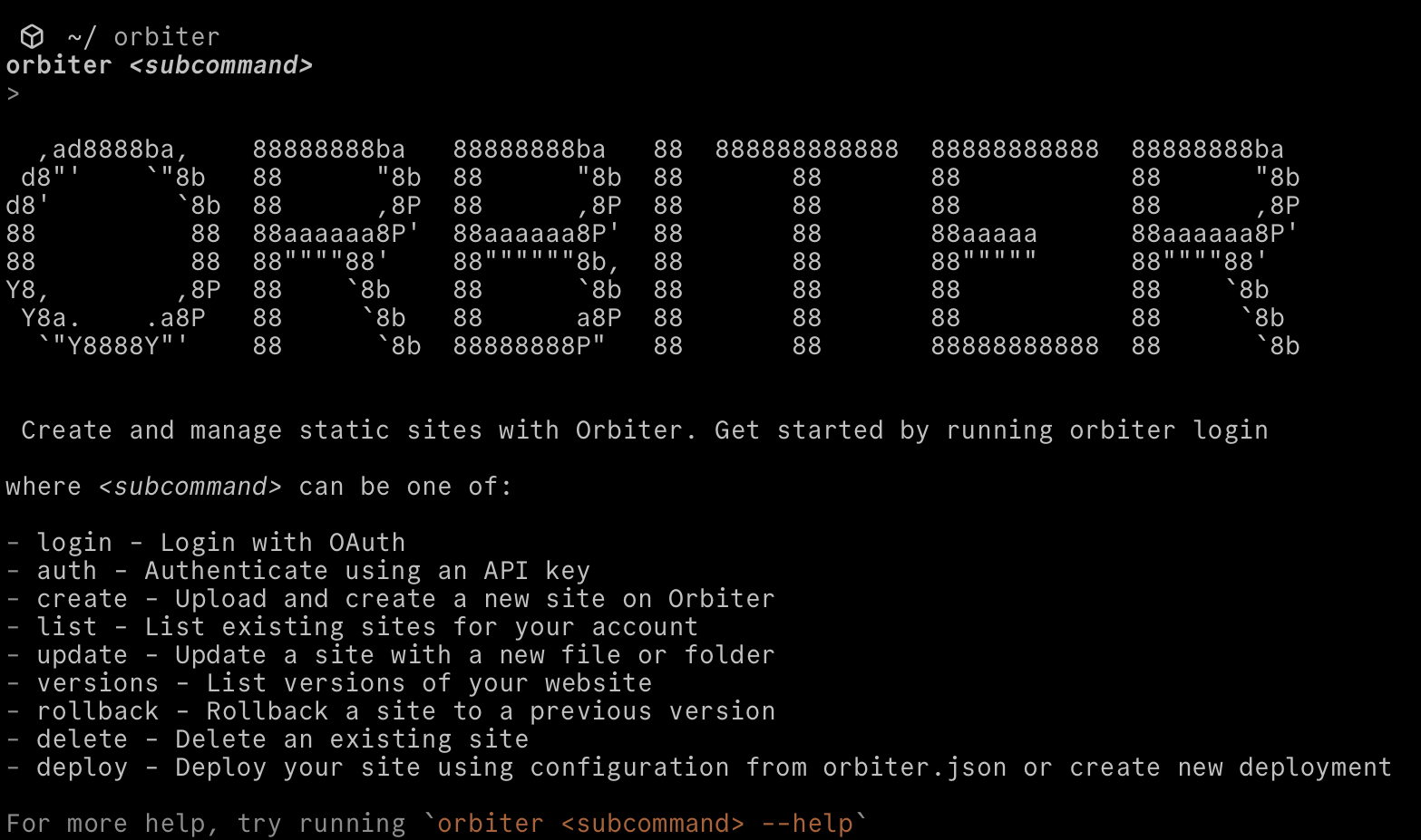 Ever since I started learning programming and web development I’ve been obsessed with the terminal. It goes back to previous jobs where I worked in IBM “green screens” where I could zip around and gather data without having to leave my keyboard, and when I discovered tools like Neovim I knew I had to learn it. As the years have passed I still love using the terminal, but what I love doing even more is building CLIs. I get a rush anytime I have the opportunity to craft the experience of using the terminal, and it brings me joy giving other developers the DX they deserve. When it came to building Orbiter’s CLI it was no exception, and I really think you’ll enjoy! In this post I’ll show you how simple it can be to deploy a site to Orbiter using our CLI and several different options you have available.